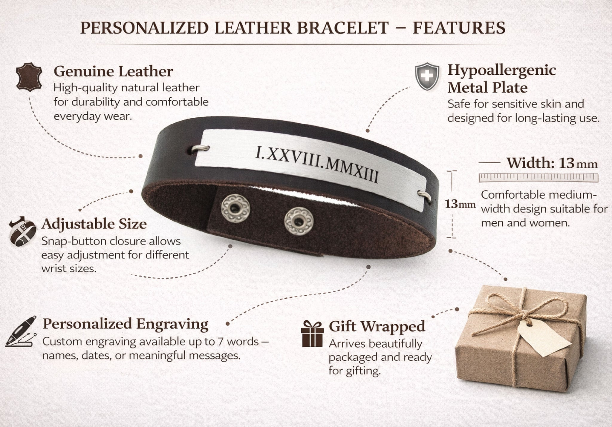 Custom Roman Numeral Date Leather Bracelet for Men a stylish and meaningful accessory designed to celebrate special moments. This elegant leather cuff bracelet features a durable genuine leather band and a polished metal ID plate engraved with your chosen Roman numeral date or a short personalized message.