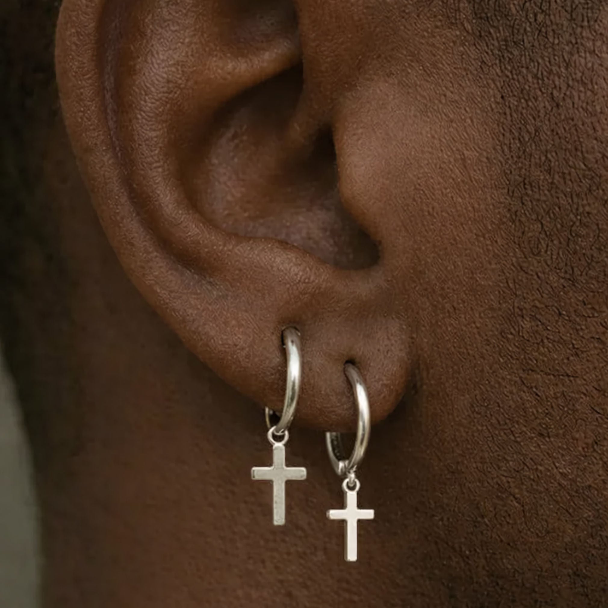 Silver cross earring for men, single hoop earring. Modern men's jewelry!