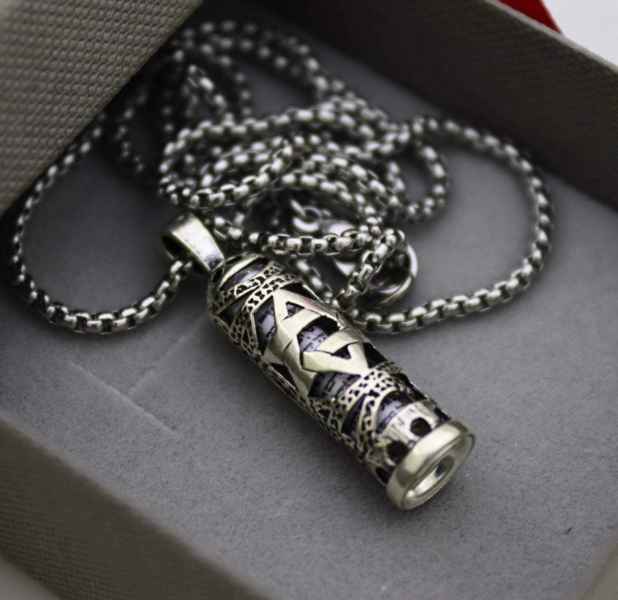 Honor Jewish faith and heritage with this handcrafted Sterling Silver Mezuzah Necklace for men and women. The pendant features a symbolic Star of David and holds a tiny Hebrew Shema Israel scroll, representing divine protection and faith. A meaningful amulet and spiritual jewelry piece, it makes a thoughtful Jewish gift from Israel for Bar Mitzvah, Hanukkah, birthday, or Messianic celebration. Beautifully crafted with attention to detail, this Mezuzah pendant carries blessings and connection to tradition a unique keepsake to wear close to the heart.