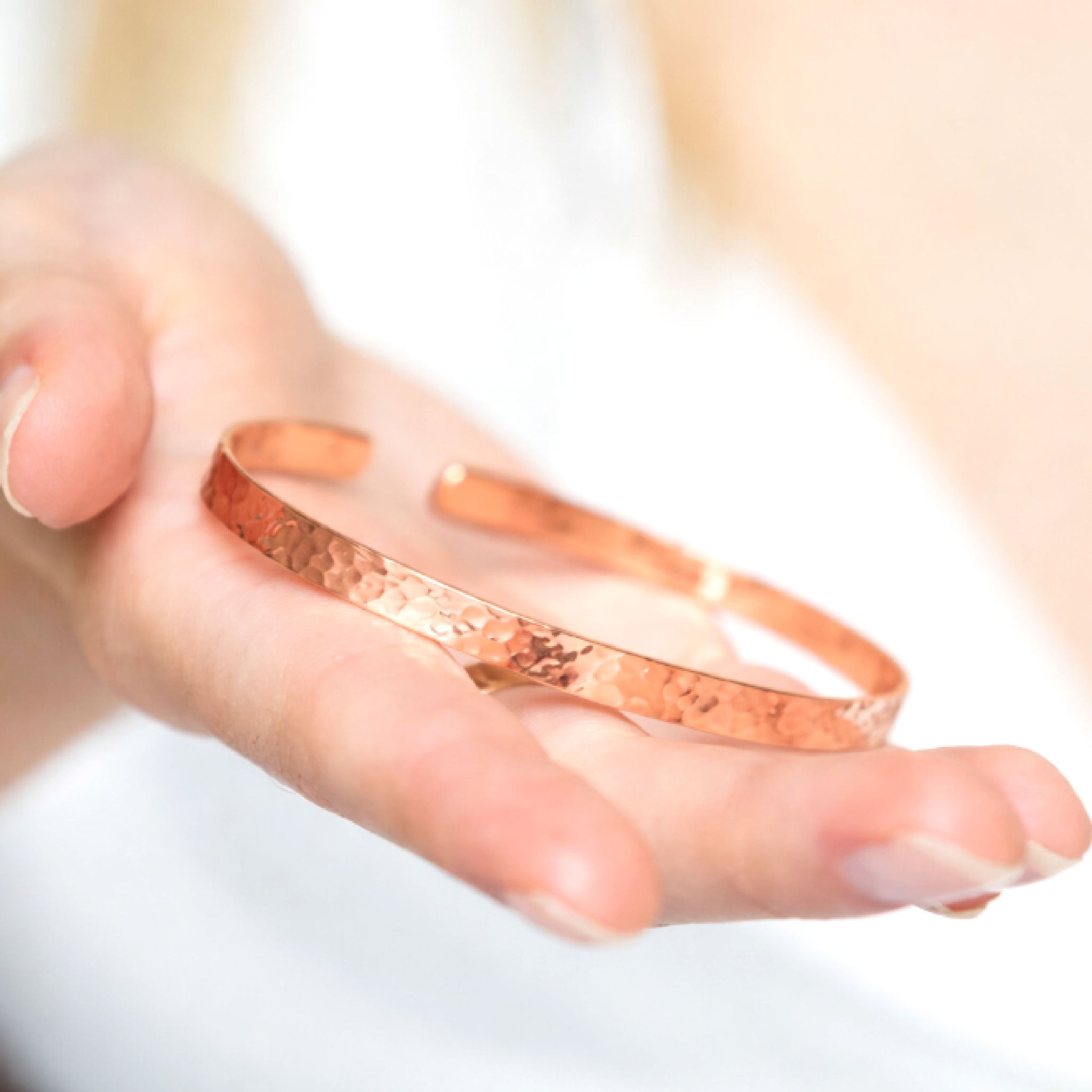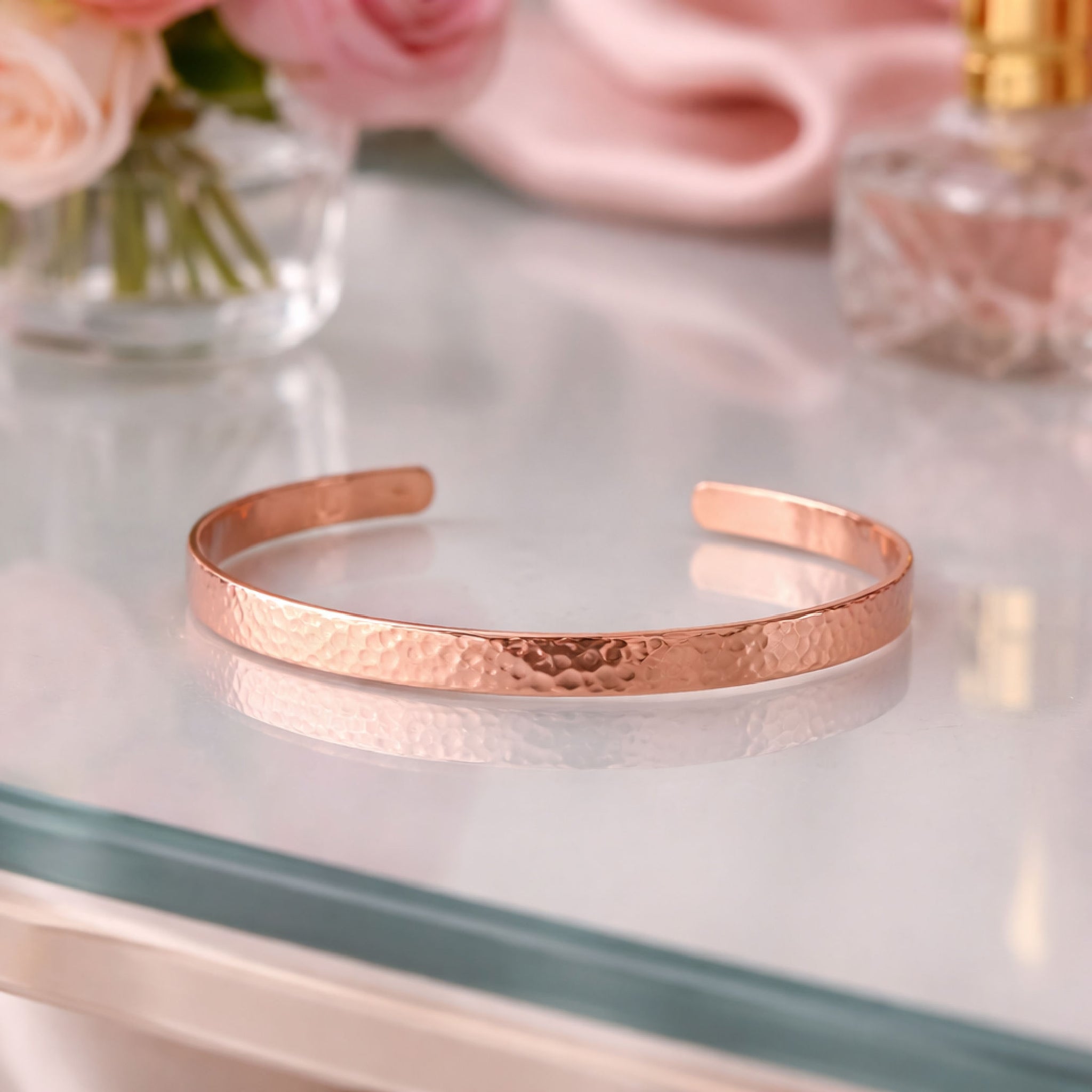The softly hammered finish reflects light beautifully and adds depth to the rose gold tone, giving the bracelet a handcrafted, artisanal feel.